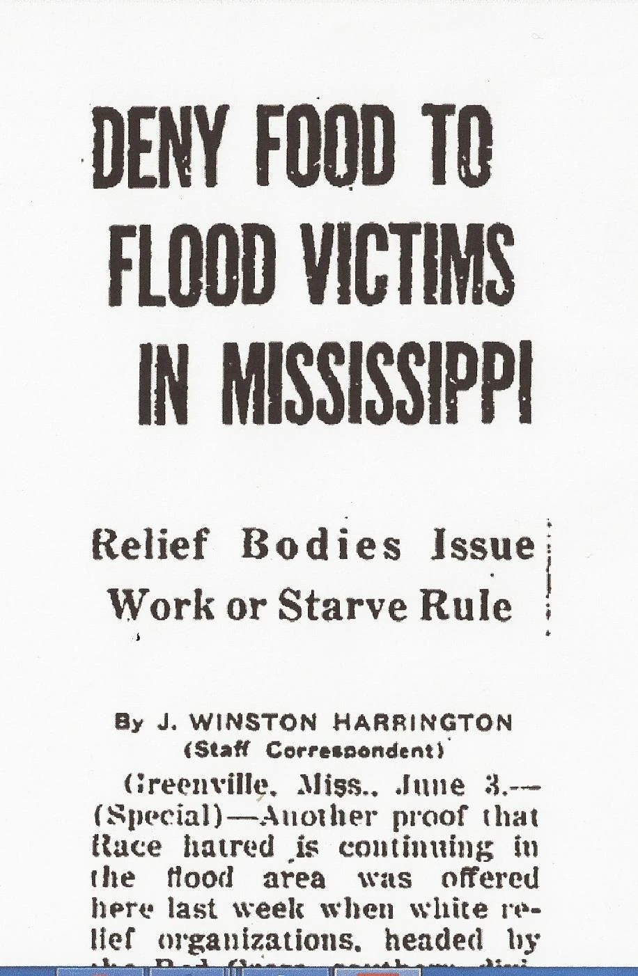 - ↑ J WINSTON HARRINGTON, Staff CorrespondentSpecial. 1927. DENY FOOD TO FLOOD SUFFERERS IN MISSISSIPPI. The Chicago Defender (National edition) (1921-1967), Jun 04, 1927. http://search.proquest.com/docview/492145106?accountid=14678 (accessed September 15, 2014).